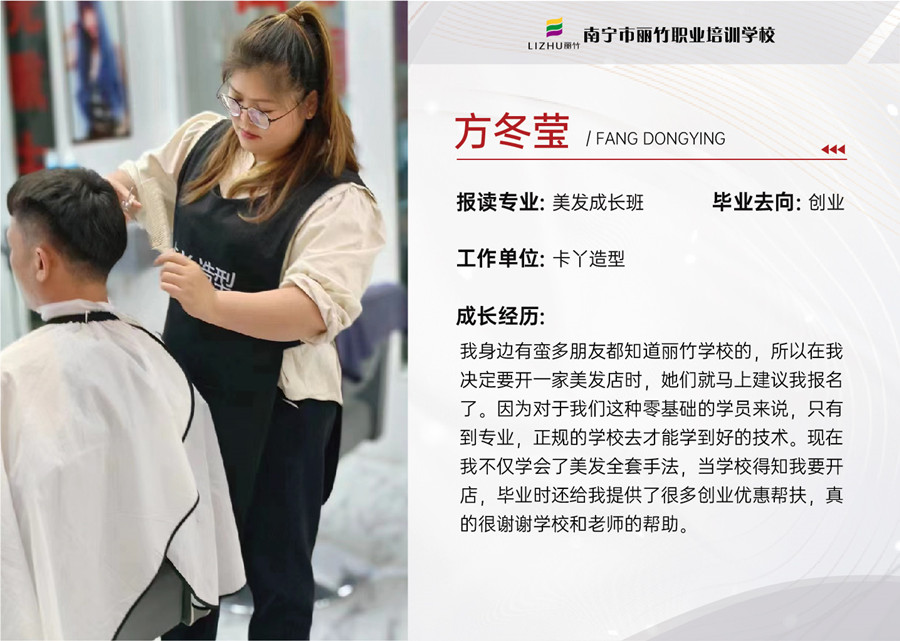 如今,她們自己開的美發(fā)店也已經(jīng)在各自的家鄉(xiāng)站穩(wěn)腳跟,生意日益紅火,日子也越過越好。同學(xué)們深知在事業(yè)上取得的成功,這一切都離不開母校的培養(yǎng)。方冬瑩更是眼含熱淚回憶起了剛剛到麗竹學(xué)習(xí)的場景。